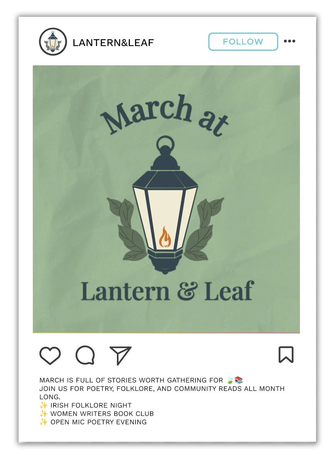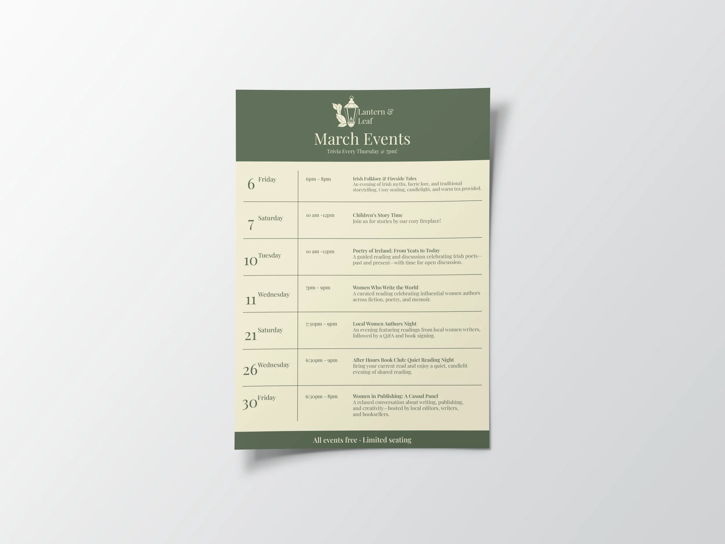 Lantern & Leaf is a conceptual independent bookstore brand created to explore how illustration-driven branding can support community-focused marketing. The store emphasizes cozy spaces, literary events, and thoughtful programming centered around storytelling and local culture.
