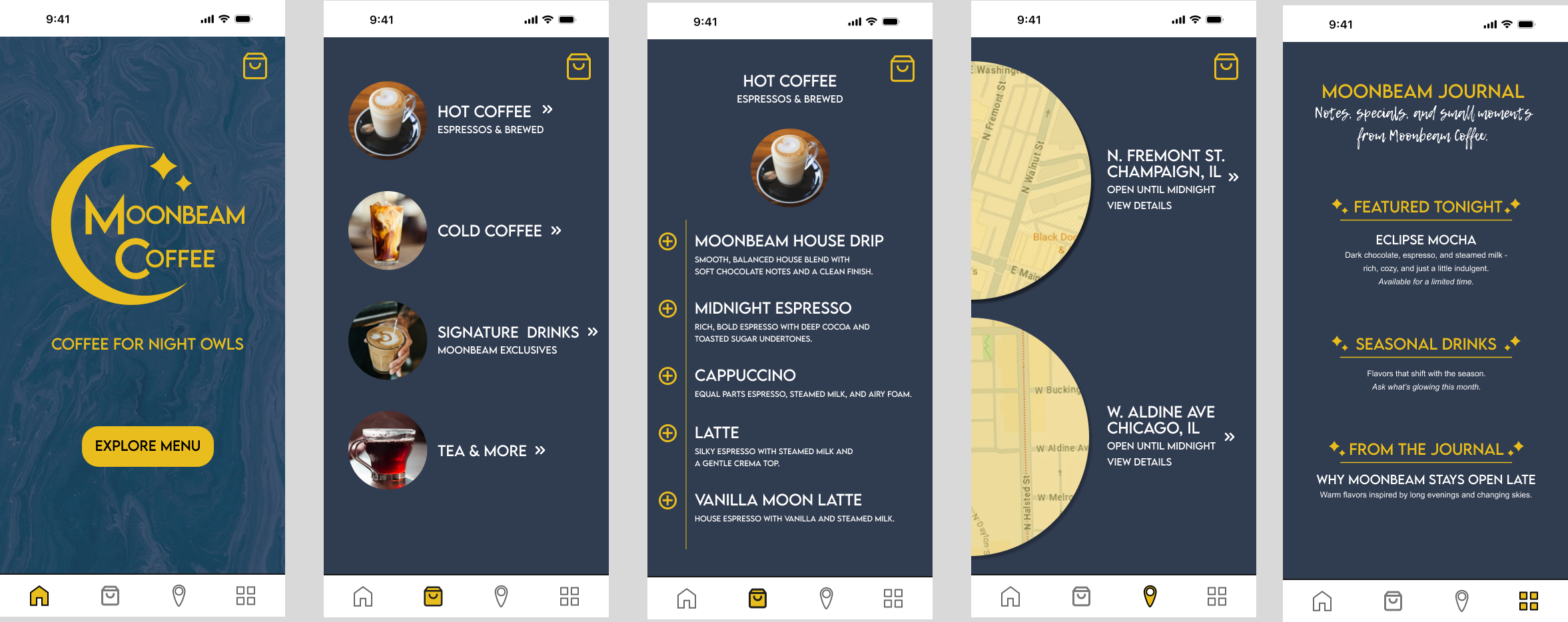 Moonbeam Coffee is a mobile-first coffee shop concept designed for late-night browsing and low-light usability. The goal was to create a calm, atmospheric experience that guides users quickly to menu and location information without overwhelming them.